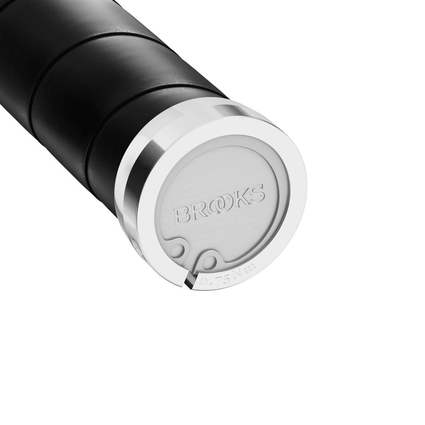 Met deze handvatten biedt Brooks de mogelijkheid om toch een schakelpook te monteren – rechts of links – als de lengte van het stuur beperkt is. Een aluminium hoes omwikkeld met het fijnste echt lederen stuurlint. Stijlvolle look en comfortabele grip, ongelooflijk goed afgewerkt.