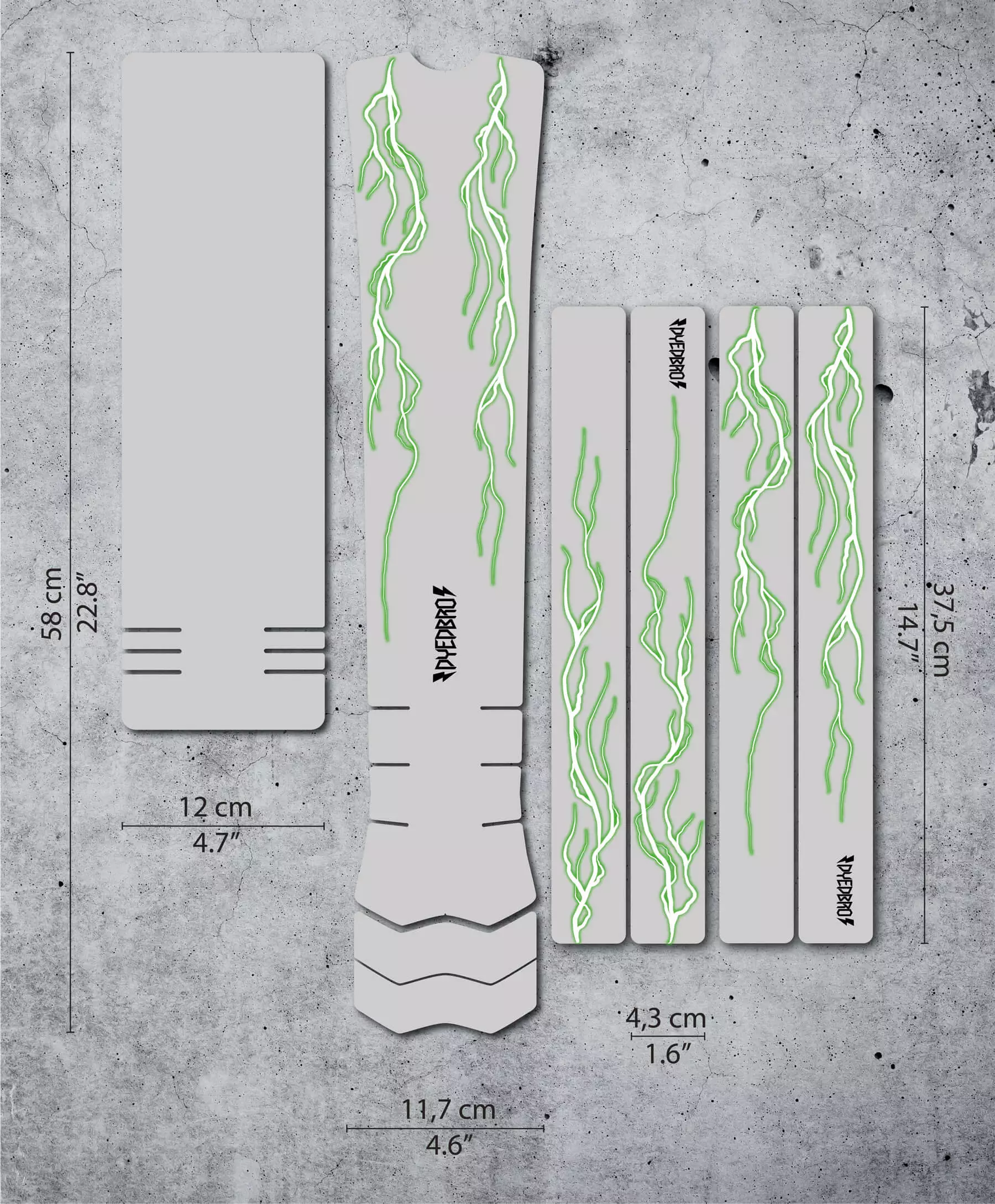 “Het is niet de rommelende donder die toeslaat, maar de stille bliksem.” Wees de bliksem tijdens het fietsen! Het eenvoudige ontwerp geeft uw fiets een bijzondere uitstraling en beschermt hem tegelijkertijd optimaal. De bliksemschichten op de heldere achtergrond passen perfect bij de look van uw frame.