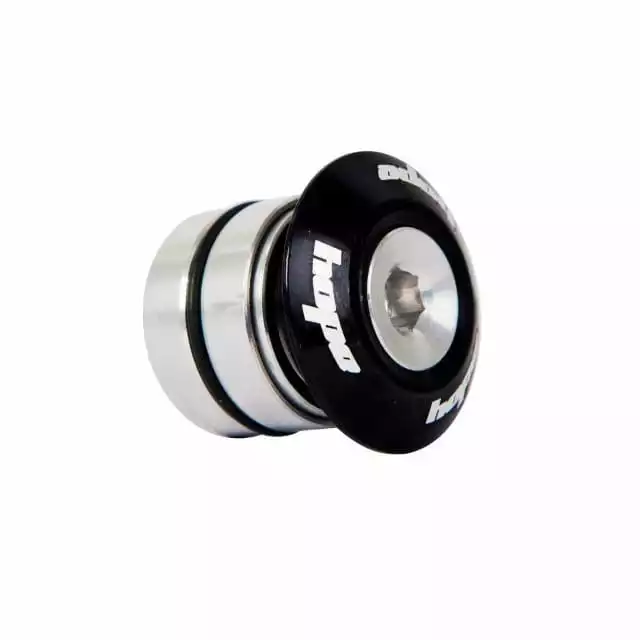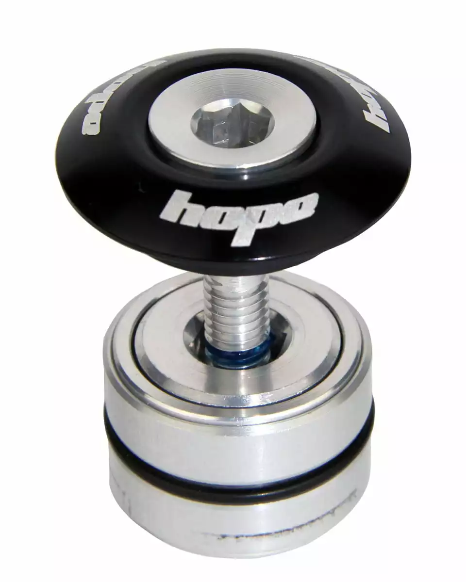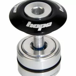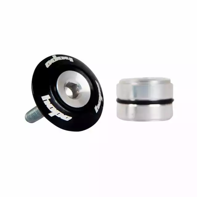 Hoop heeft een technische oplossing. Twee kegelvormige pluggen worden samengetrokken om de diameter van de eenheid te vergroten en de plug stevig in de vork te houden. Zo ontstaat een stevige draad voor de bevestiging van de steel. Klinkt simpel? Dat is zo. Hope maakt het af met een laser geëtste dop en aluminium bout.