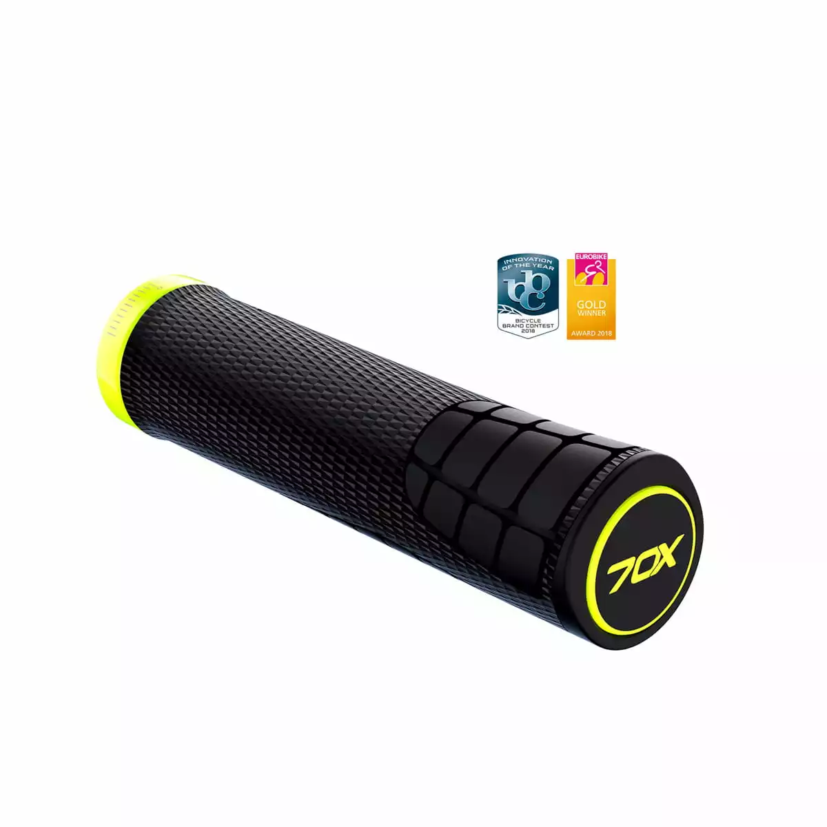 De 70X grip is de perfecte grip ergonomie voor gevorderde rijders. De Gravity en Downhill grip bieden maximale controle en grip in ruw terrein, zelfs in natte en modderige omstandigheden. Bij de levering zijn twee paar handvatten inbegrepen. De speciale textuurzone aan de voor- en onderzijde biedt de vingers een optimale grip in elke situatie. De buitenkant zorgt voor het nodige comfort. De klemming is tijdens de productontwikkeling van buiten naar binnen verplaatst en bevindt zich alleen in het eerste (binnenste) derde deel. Dit verhoogt de demping en het comfort aan de buitenkant van de hand. Verschillende rubbersamenstellingen zorgen voor een perfecte grip en een hoog comfort. Wij gebruiken alleen de best mogelijke materialen. Dit garandeert u een lange levensduur en geen vastplakken van het greeprubber. De individuele greepbreedte is doorslaggevend. Bij de 7OX greep verschillen de maten in diameter en vorm.